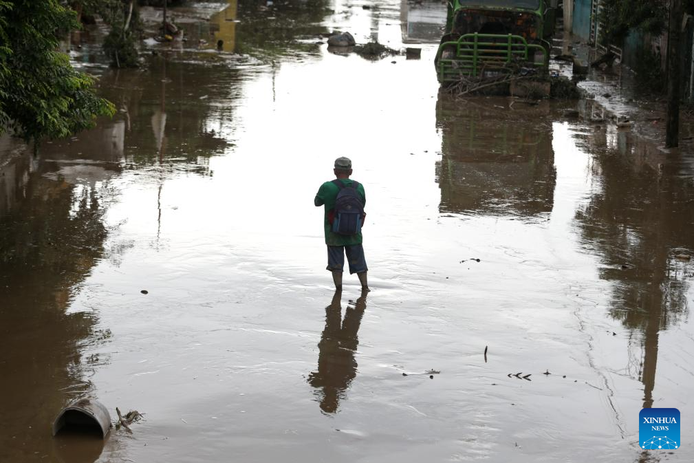 A man wades through a street flooded by rain in the city of Poza Rica, Veracruz state, Mexico, on Oct. 11, 2025. At least 41 people have been killed as torrential rains and landslides battered Mexico in recent days. (Photo by Francisco Canedo/Xinhua)