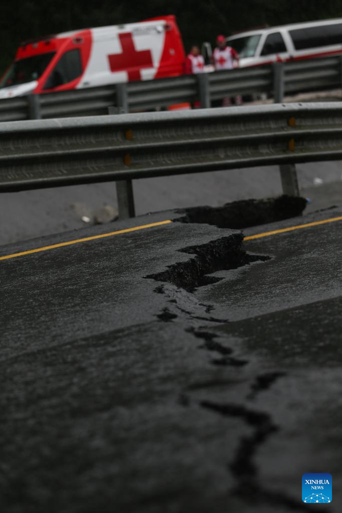 A section of highway damaged by rain is pictured in Huauchinango, Puebla state, Mexico, Oct. 11, 2025. At least 41 people have been killed as torrential rains and landslides battered Mexico in recent days. (Photo by Francisco Canedo/Xinhua)