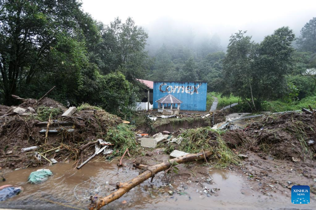 This photo taken on Oct. 11, 2025 shows a blocked road affected by rain in Huauchinango, Puebla state, Mexico. At least 41 people have been killed as torrential rains and landslides battered Mexico in recent days. (Photo by Francisco Canedo/Xinhua)