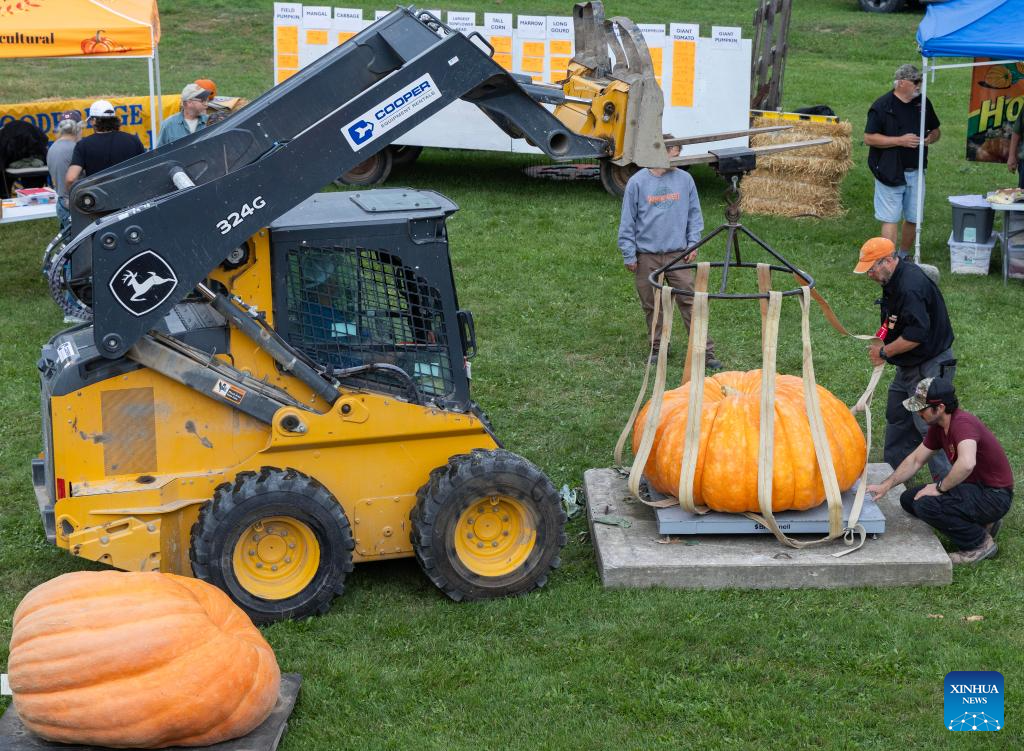 Staff members weigh a giant pumpkin during a giant pumpkin contest at the Woodbridge Fall Fair in Woodbridge, Ontario, Canada, on Oct. 11, 2025. The annual contest was held here on Saturday. (Photo by Zou Zheng/Xinhua)