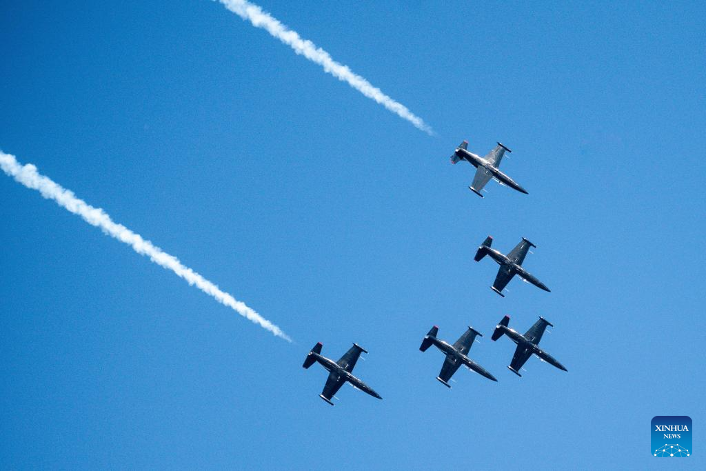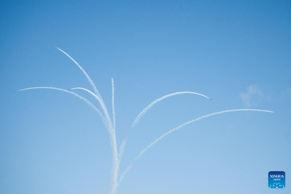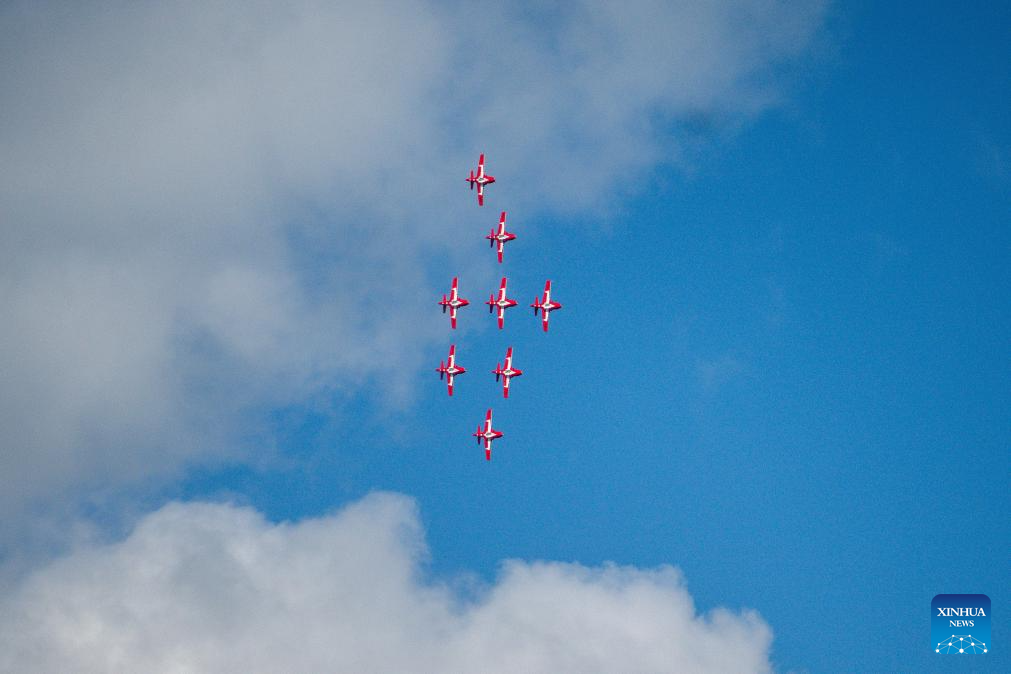 The Canadian Snowbirds perform during the annual Fleet Week air show in San Francisco, California, the United States, on Oct. 11, 2025. (Photo by Ziyu Julian Zhu/Xinhua)