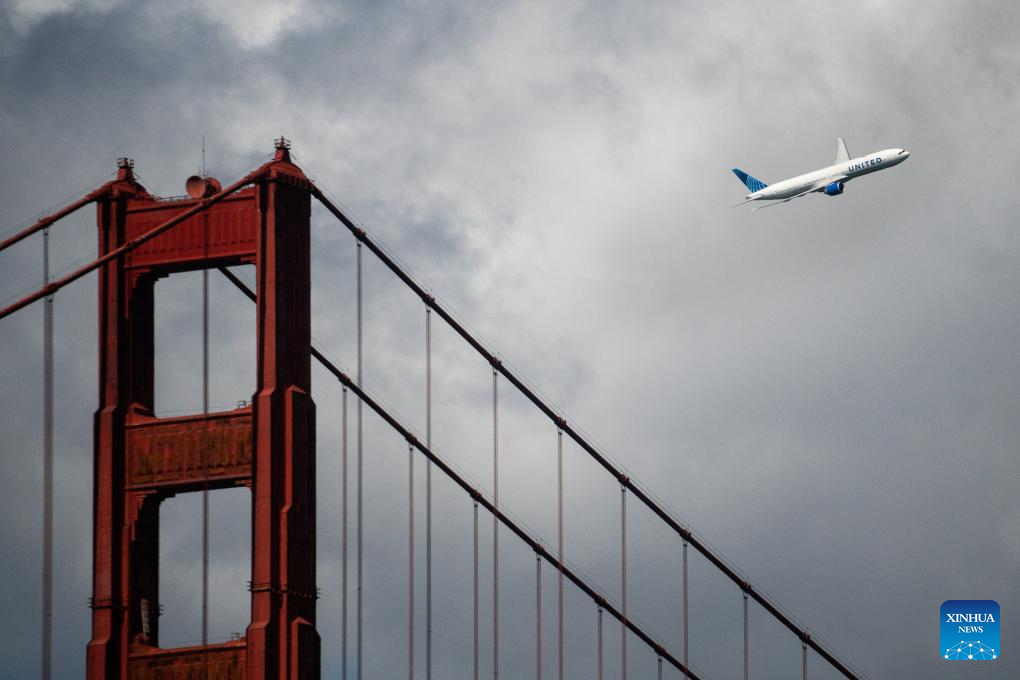 A United Airlines Boeing 777 performs during the annual Fleet Week air show in San Francisco, California, the United States, on Oct. 11, 2025. (Photo by Ziyu Julian Zhu/Xinhua)