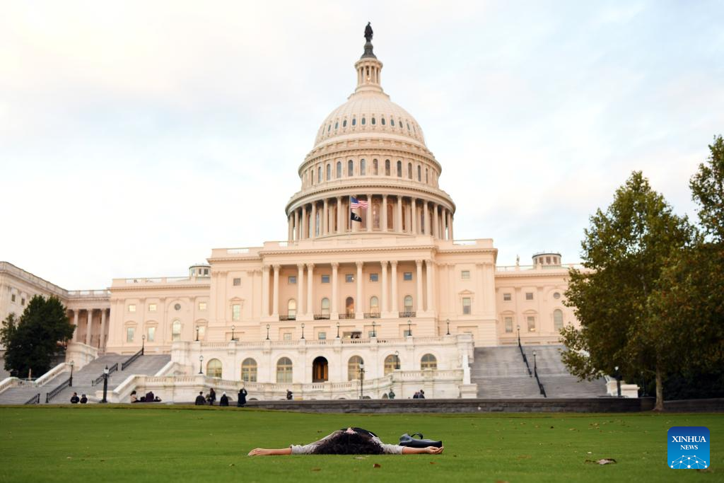 A woman lies down on a lawn in front of the U.S. Capitol building in Washington, D.C., the United States, on Oct. 15, 2025. (Xinhua/Li Rui)