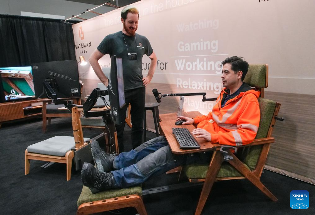 A man tries out a gaming furniture set during the 2025 Vancouver Fall Home Show at the Vancouver Convention Centre in Vancouver, Canada, Oct. 23, 2025. The 2025 Vancouver Fall Home Show kicked off here on Thursday and will last until Sunday, showcasing home-related products and services. (Photo by Liang Sen/Xinhua)