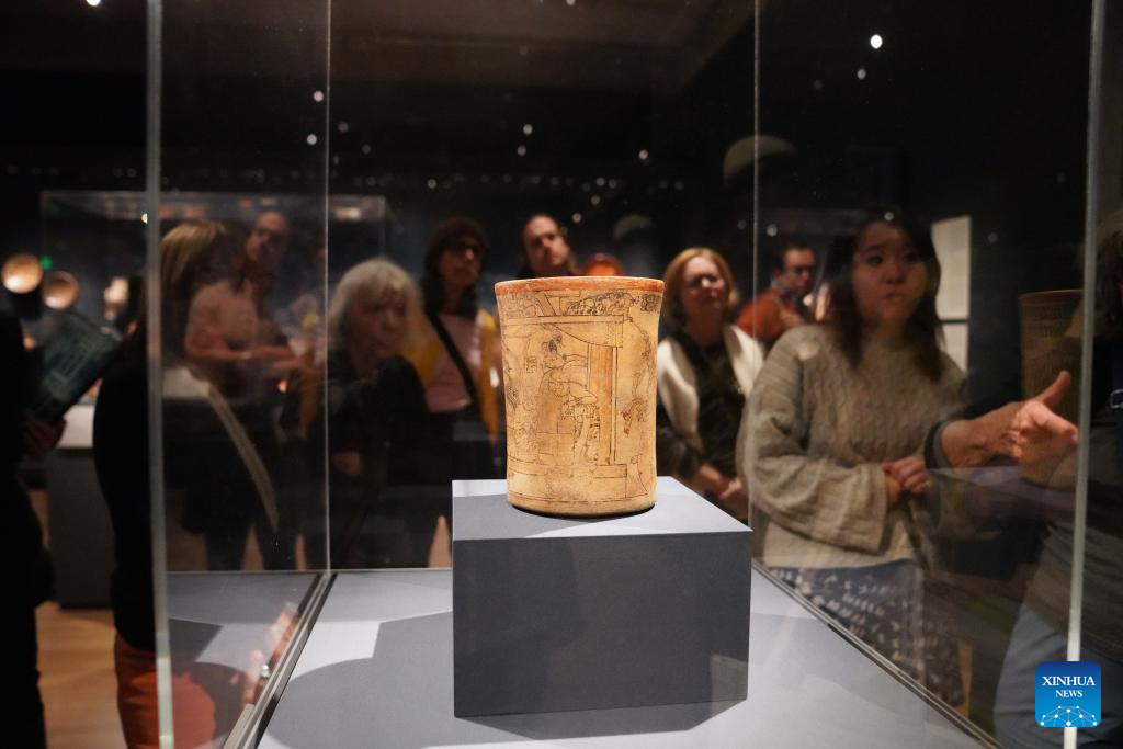 People look at a drinking cup from late classic period at the Princeton University Art Museum in New Jersey, the United States, on Nov. 1, 2025. After 13 years of design and construction, the new art museum of Princeton University reopened its doors to the general public with a 24-hour party from 5 p.m. Oct. 31, to 5 p.m. Nov. 1. (Xinhua/Zhang Fengguo)