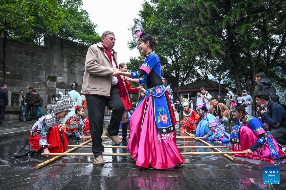 Foreign guests tries ethnic dances with local performers in Maotai Town, Renhuai City, southwest China's Guizhou Province, Oct. 29, 2025. (Xinhua/Yang Wenbin)