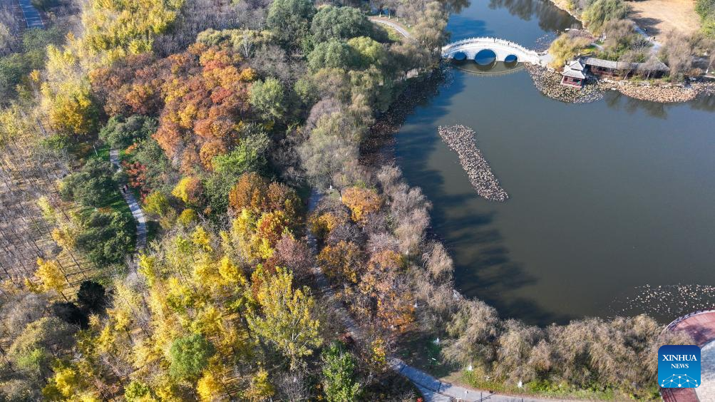 An aerial drone photo taken on Nov. 4, 2025 shows the autumn scenery of a forest park in Tianjin, north China. (Xinhua/Sun Fanyue)