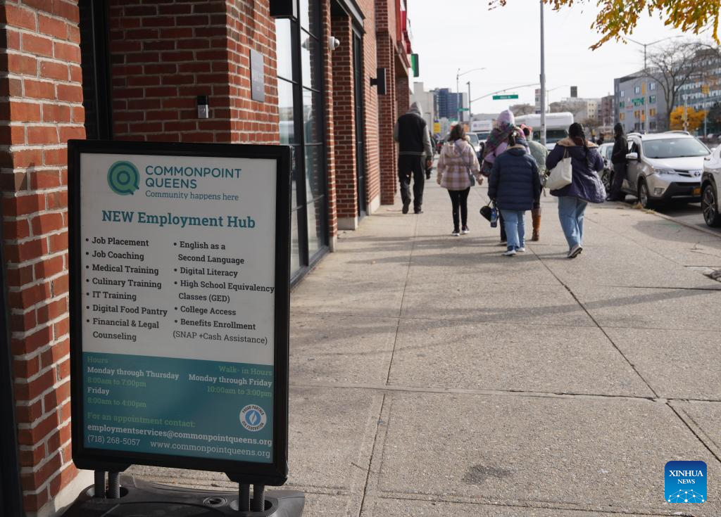 People walk past a community job center in New York, the United States, on Nov. 7, 2025. Due to U.S. federal government shutdown, scheduled release of non-farm payroll data for October was delayed again.