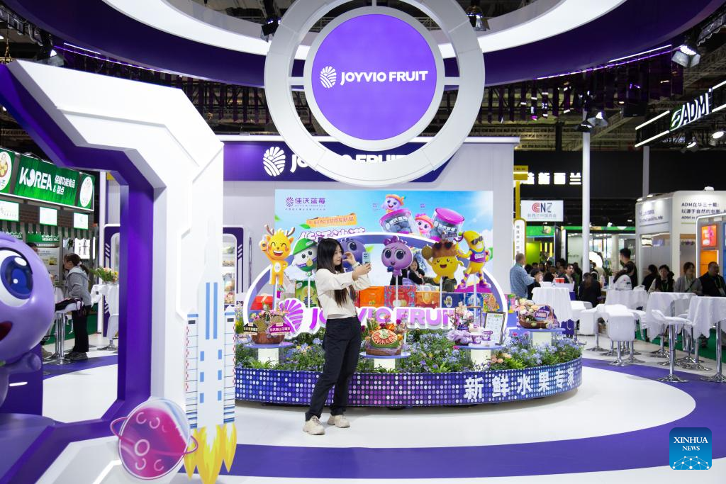 A visitor takes a selfie at the Food and Agricultural Products exhibition area of the eighth China International Import Expo (CIIE) in east China's Shanghai, Nov. 10, 2025. The 8th CIIE concluded here on Monday. (Xinhua/Tian Weiwei)