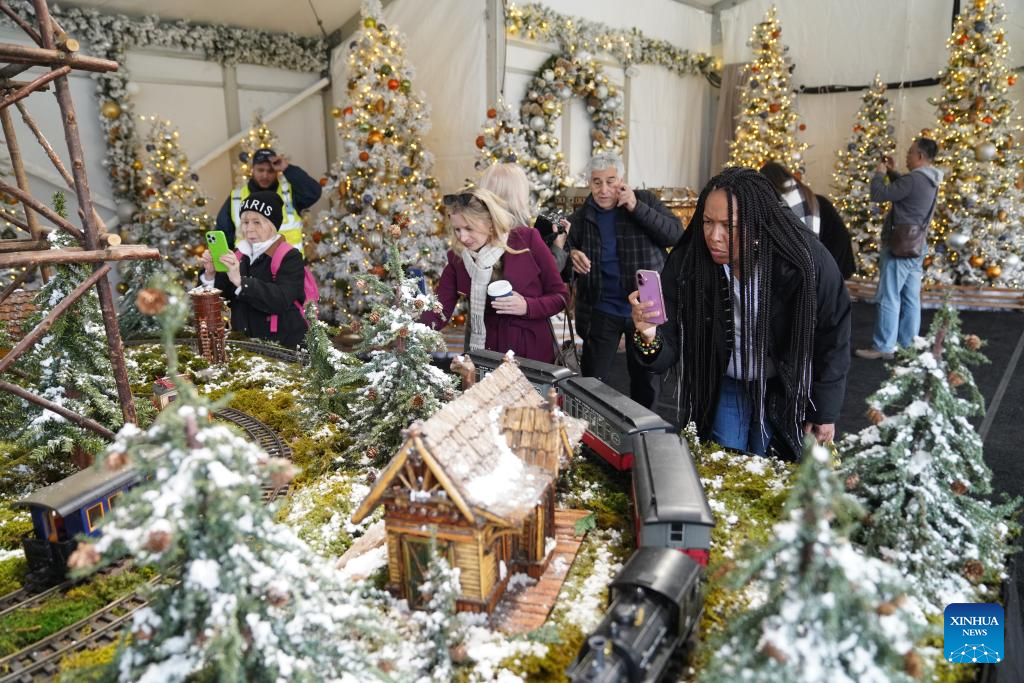 Visitors watch model trains during a preview of the Holiday Train Show at New York Botanical Garden in New York, the United States, on Nov. 11, 2025. A preview for the Holiday Train Show, which is open to the public from Nov. 15, 2025 to Jan. 11, 2026, was held at the New York Botanical Garden on Tuesday, showcasing large-scale model trains running in a miniature New York City where nearly 200 scaled iconic buildings and structures are recreated using bark, leaves and other natural materials. (Xinhua/Zhang Fengguo)