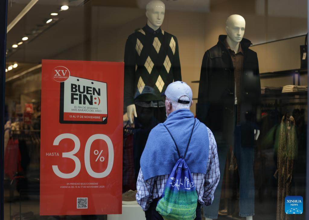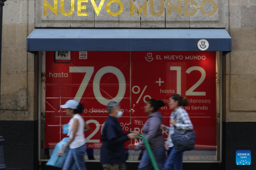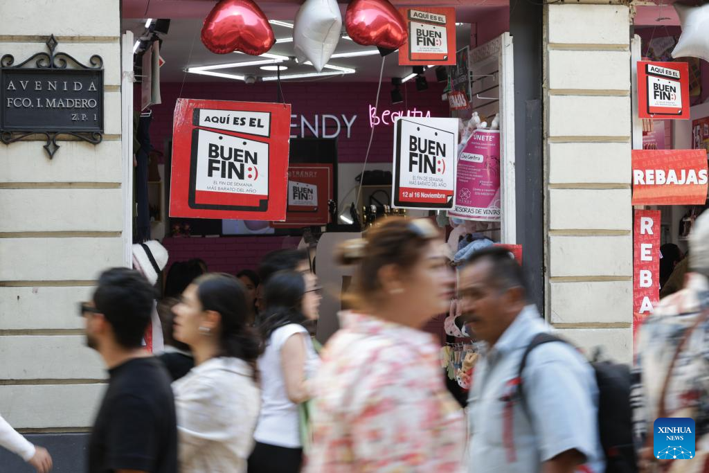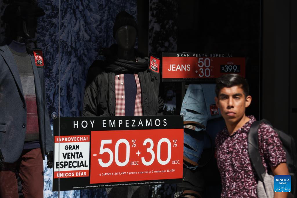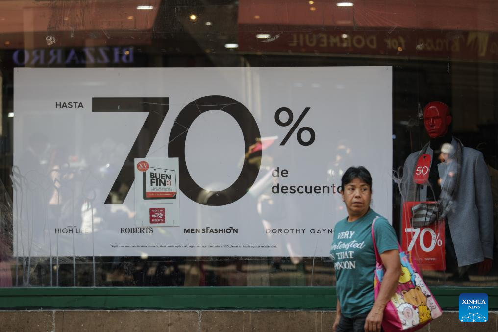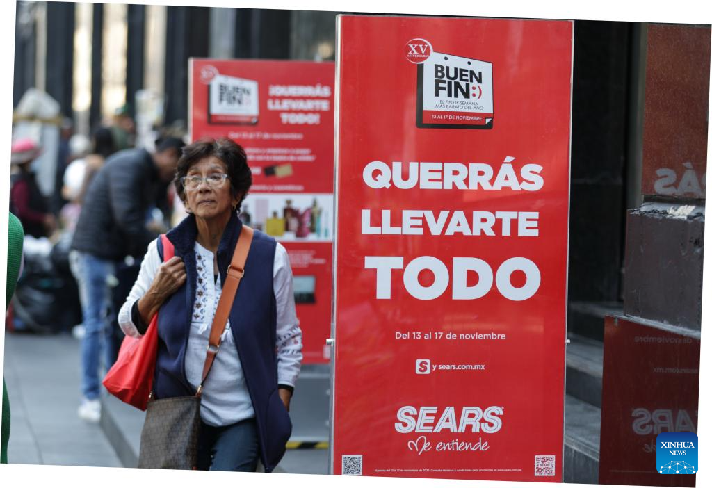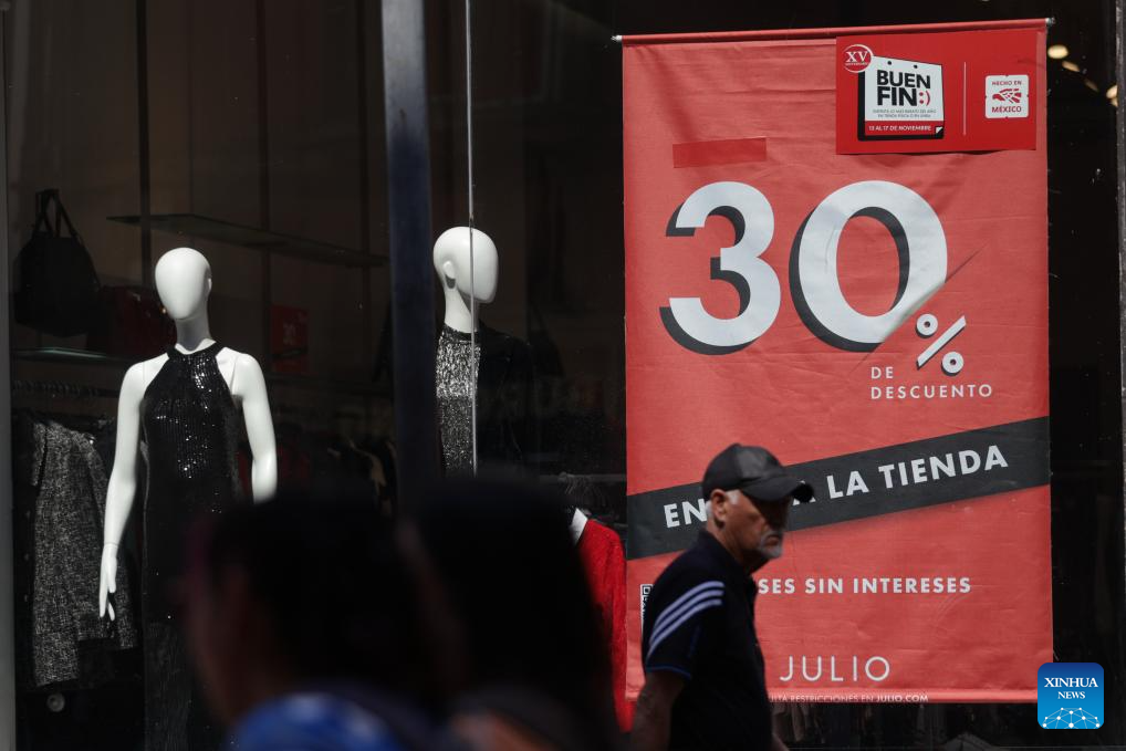 People walk past a store at the first day of the special sales event known as "El Buen Fin," in Mexico City, capital of Mexico, Nov. 13, 2025. (Xinhua/Francisco Canedo)