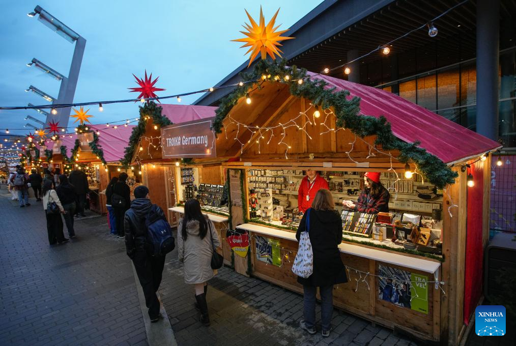 People visit the Vancouver Christmas Market in Vancouver, British Columbia, Canada, Nov. 14, 2025. The annual festive event features more than 110 wooden huts offering various handicrafts, traditional European food, drink, and souvenirs, along with live performances. This year's market opened here on Thursday and will run until Dec. 24. (Photo by Liang Sen/Xinhua)