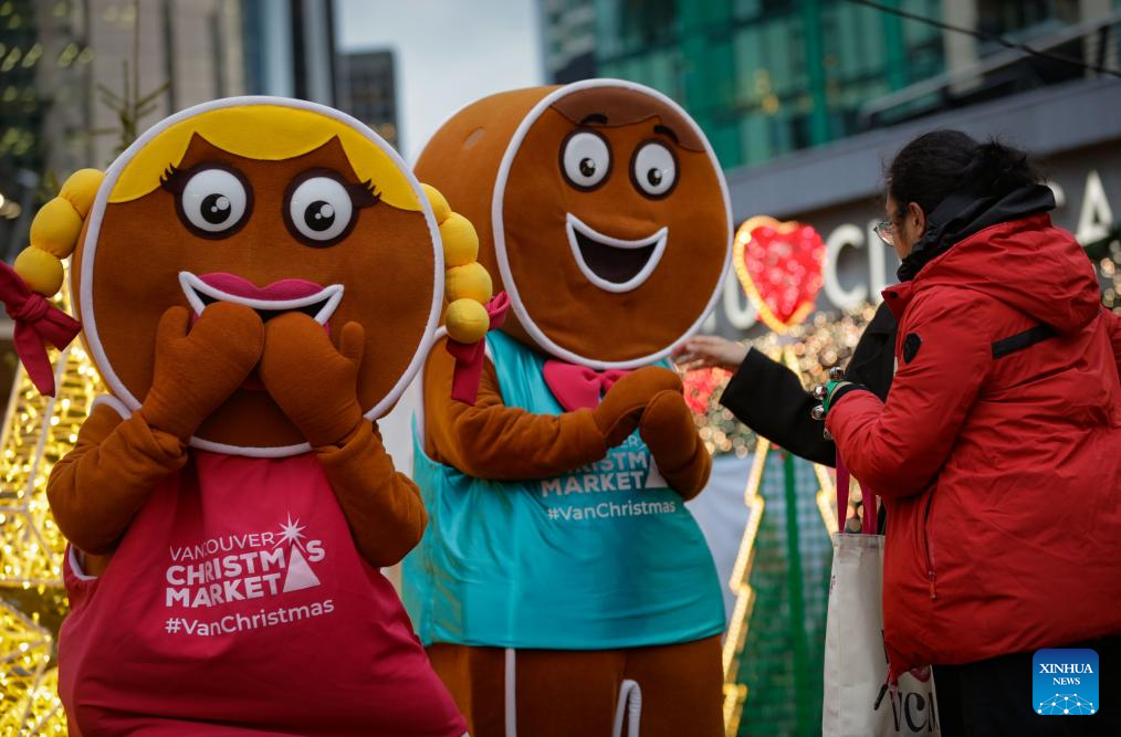 Performers dressed as gingerbread men interact with visitors at the Vancouver Christmas Market in Vancouver, British Columbia, Canada, Nov. 14, 2025. The annual festive event features more than 110 wooden huts offering various handicrafts, traditional European food, drink, and souvenirs, along with live performances. This year's market opened here on Thursday and will run until Dec. 24. (Photo by Liang Sen/Xinhua)