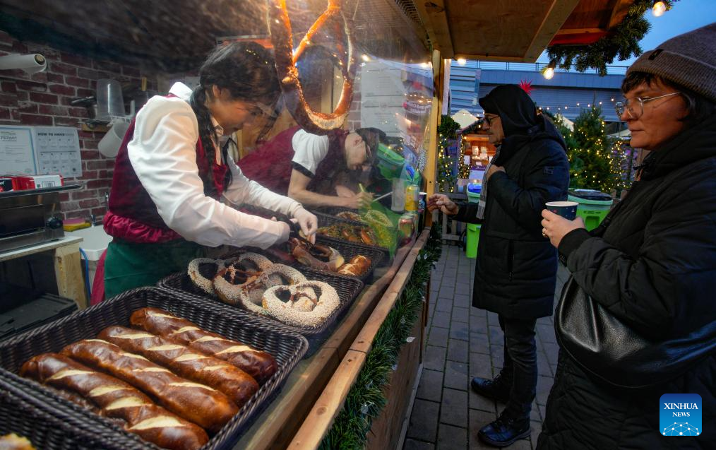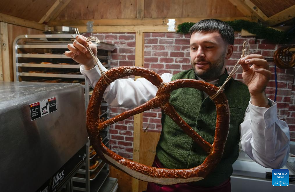 A vendor shows a large pretzel in a wooden hut at the Vancouver Christmas Market in Vancouver, British Columbia, Canada, Nov. 14, 2025. The annual festive event features more than 110 wooden huts offering various handicrafts, traditional European food, drink, and souvenirs, along with live performances. This year's market opened here on Thursday and will run until Dec. 24. (Photo by Liang Sen/Xinhua)