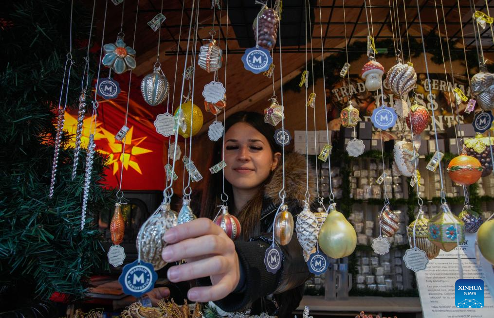 A vendor shows decorative ornaments in a wooden hut at the Vancouver Christmas Market in Vancouver, British Columbia, Canada, Nov. 14, 2025. The annual festive event features more than 110 wooden huts offering various handicrafts, traditional European food, drink, and souvenirs, along with live performances. This year's market opened here on Thursday and will run until Dec. 24. (Photo by Liang Sen/Xinhua)