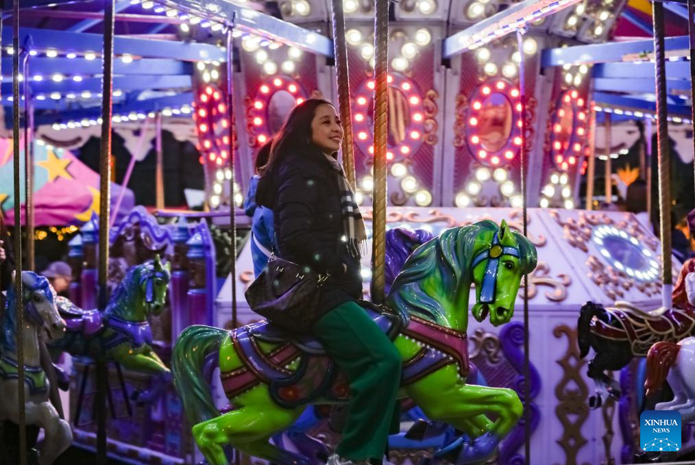 A visitor enjoys a merry-go-round at the Vancouver Christmas Market in Vancouver, British Columbia, Canada, Nov. 14, 2025. The annual festive event features more than 110 wooden huts offering various handicrafts, traditional European food, drink, and souvenirs, along with live performances. This year's market opened here on Thursday and will run until Dec. 24. (Photo by Liang Sen/Xinhua)