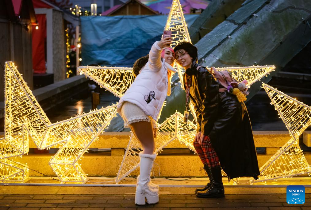 Visitors pose for photos with the light installations at the Vancouver Christmas Market in Vancouver, British Columbia, Canada, Nov. 14, 2025. The annual festive event features more than 110 wooden huts offering various handicrafts, traditional European food, drink, and souvenirs, along with live performances. This year's market opened here on Thursday and will run until Dec. 24. (Photo by Liang Sen/Xinhua)