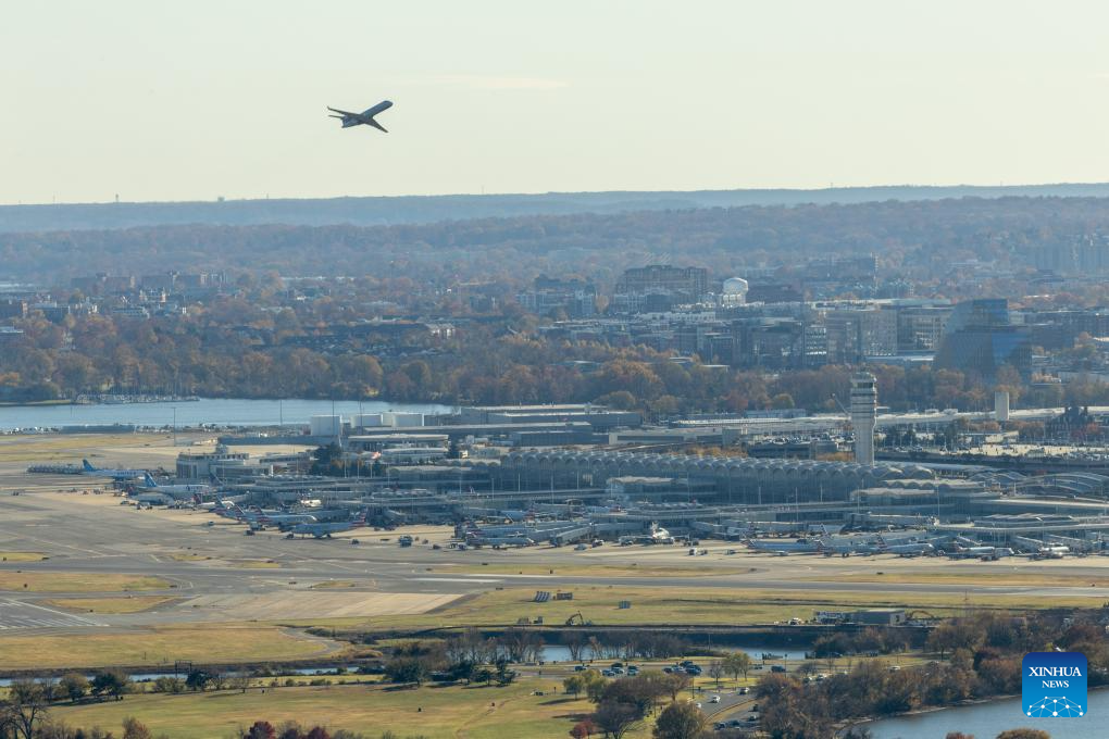 The photo taken from atop the Washington Monument on Nove. 17, 2025 shows Ronald Reagan Washington National Airport in Arlington, Virginia, the United States. (Xinhua/Hu Yousong)