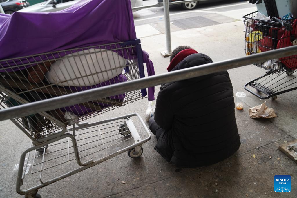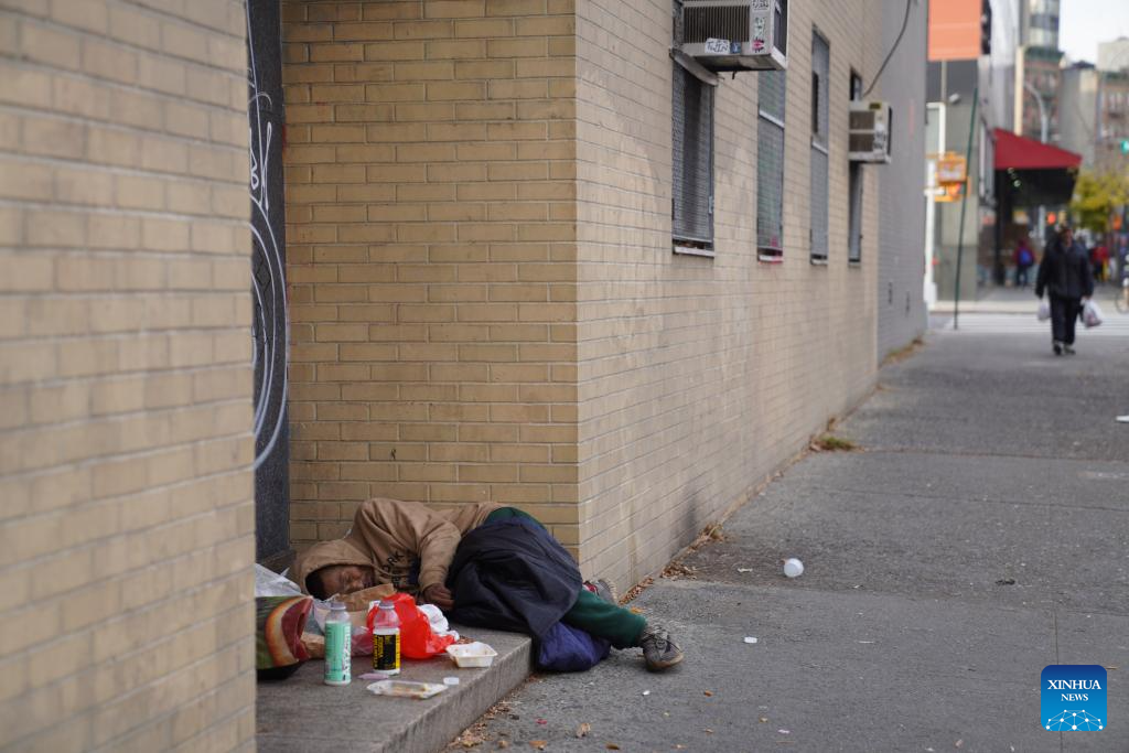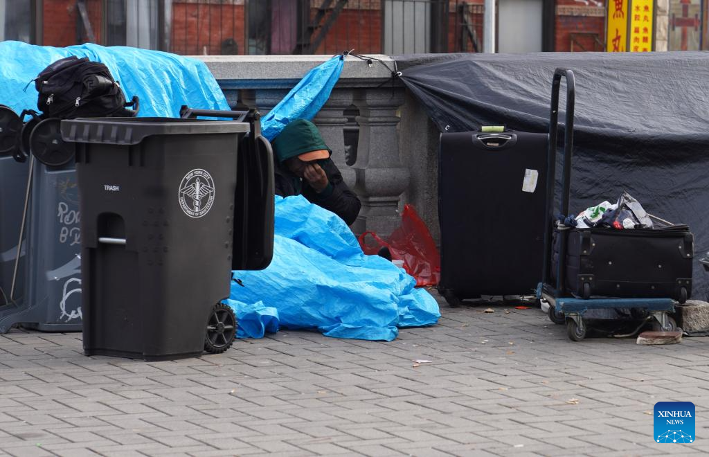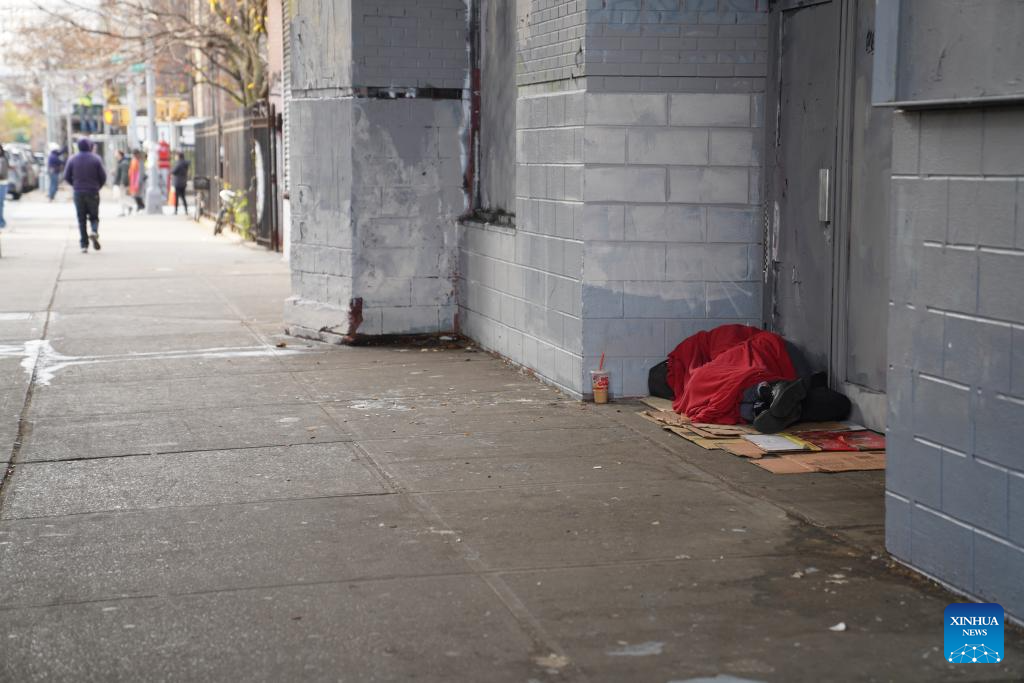 A man sleeps by a street near a shelter for the homeless in New York, the United States, on Nov. 21, 2025. It is estimated that more than 350,000 people were without home in New York City (NYC) by August this year, the highest level since the Great Depression of the 1930s, according to the Coalition for the Homeless. Most of them slept in NYC shelters or temporarily doubled-up in the homes of others, and thousands slept unsheltered on streets, parks and subways. (Xinhua/Zhang Fengguo)