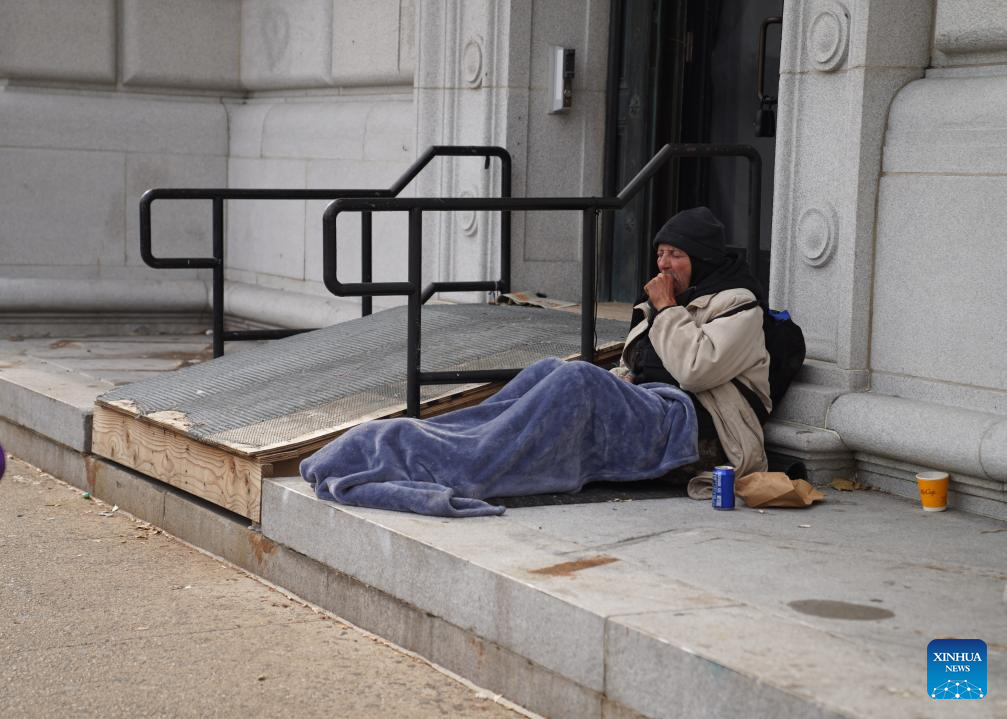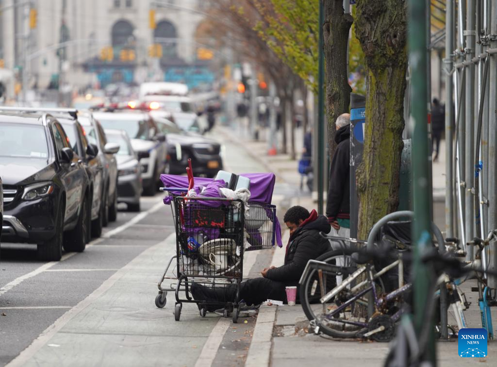 A man sits by a street near a shelter for the homeless in New York, the United States, on Nov. 21, 2025. It is estimated that more than 350,000 people were without home in New York City (NYC) by August this year, the highest level since the Great Depression of the 1930s, according to the Coalition for the Homeless. Most of them slept in NYC shelters or temporarily doubled-up in the homes of others, and thousands slept unsheltered on streets, parks and subways. (Xinhua/Zhang Fengguo)