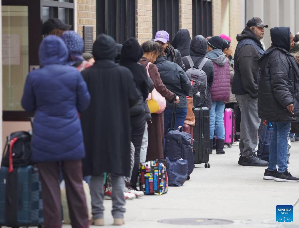 People with their luggage line up for dinner at a shelter for the homeless in New York, the United States, on Nov. 21, 2025. It is estimated that more than 350,000 people were without home in New York City (NYC) by August this year, the highest level since the Great Depression of the 1930s, according to the Coalition for the Homeless. Most of them slept in NYC shelters or temporarily doubled-up in the homes of others, and thousands slept unsheltered on streets, parks and subways. (Xinhua/Zhang Fengguo)