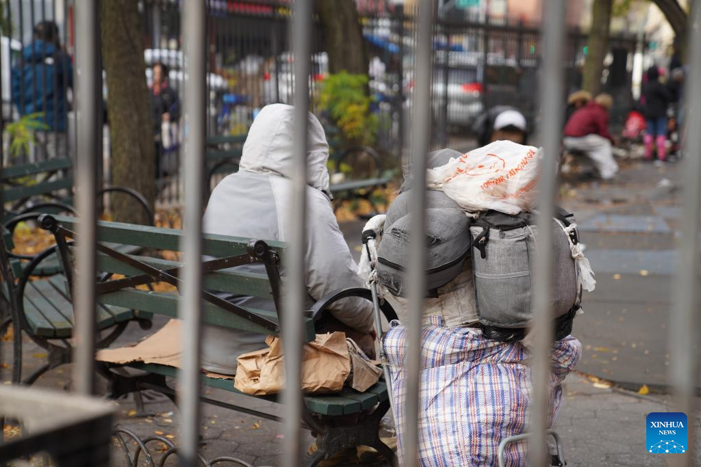 A man with his luggage sits in a park bench near a shelter for the homeless in New York, the United States, on Nov. 21, 2025. It is estimated that more than 350,000 people were without home in New York City (NYC) by August this year, the highest level since the Great Depression of the 1930s, according to the Coalition for the Homeless. Most of them slept in NYC shelters or temporarily doubled-up in the homes of others, and thousands slept unsheltered on streets, parks and subways. (Xinhua/Zhang Fengguo)