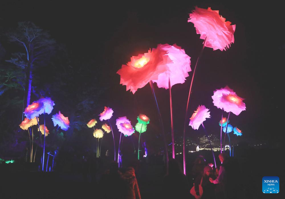 This photo taken on Nov. 21, 2025 shows a view of Lightscape, an immersive trail of lights at the San Francisco Botanical Garden, in San Francisco, the United States. (Photo by Liu Yilin/Xinhua)