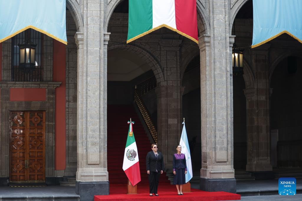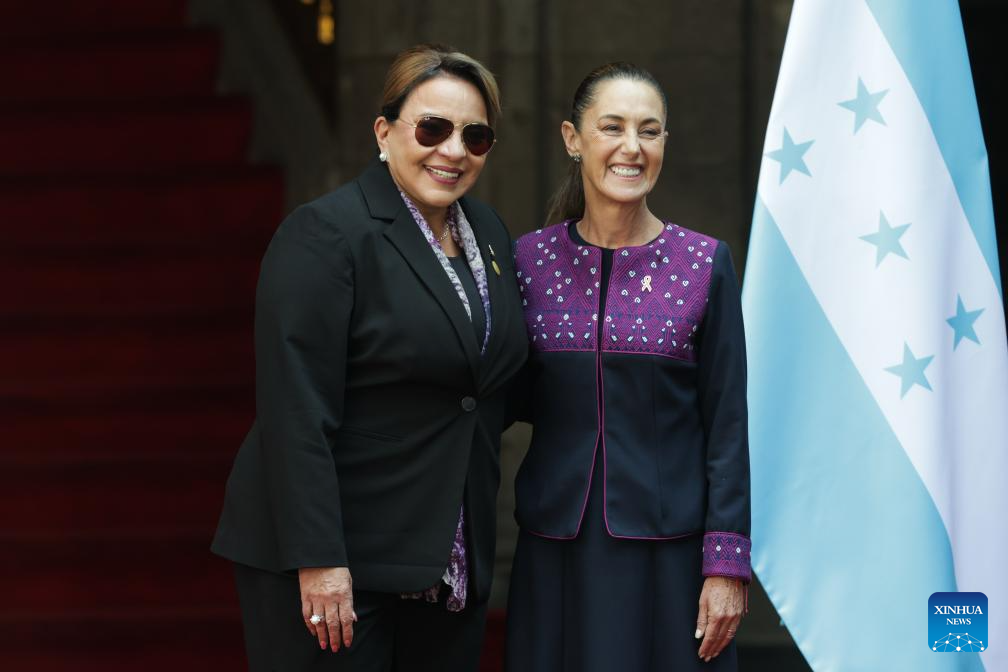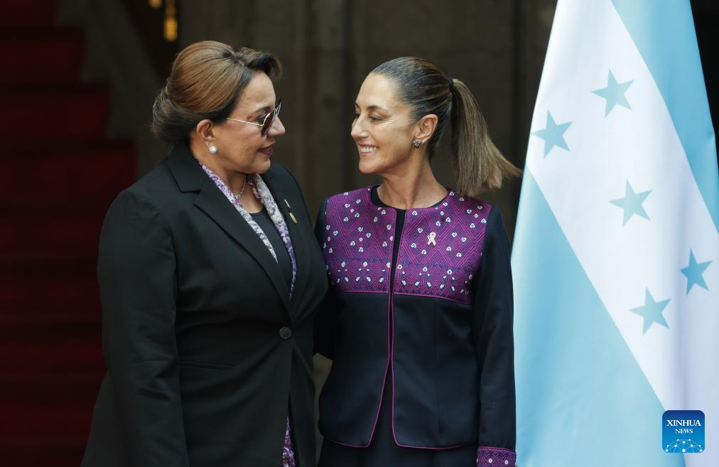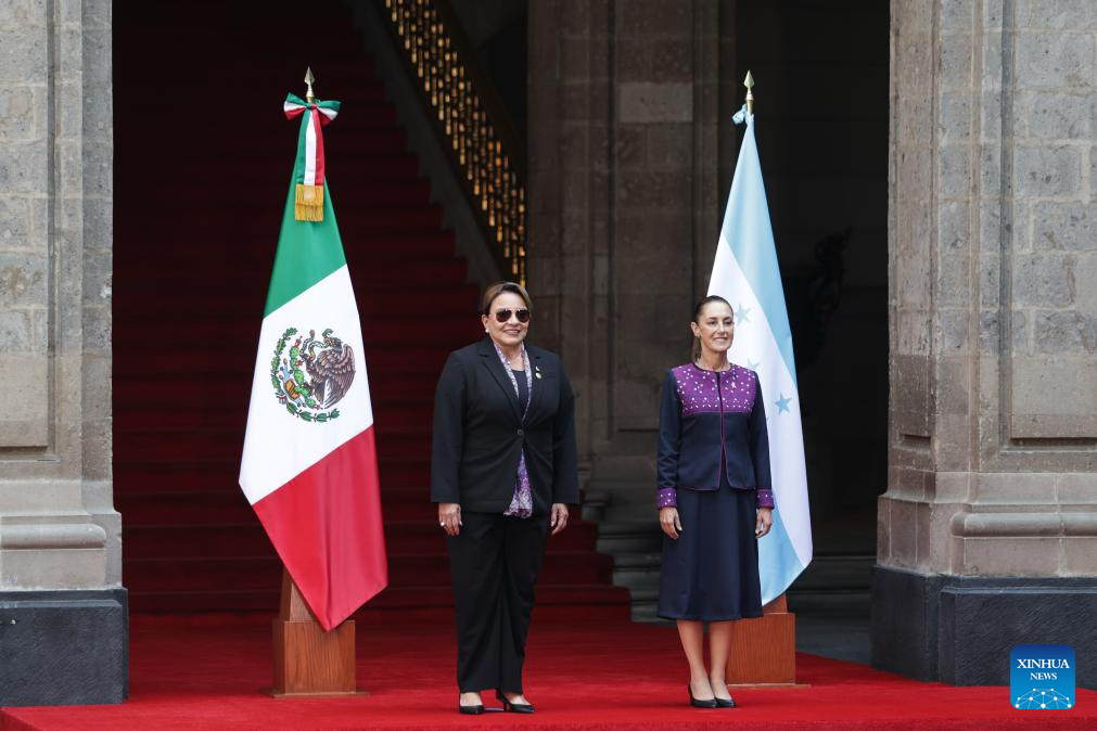 Mexican President Claudia Sheinbaum (R) hosts a welcome ceremony for visiting Honduran President Xiomara Castro in Mexico City, Mexico on Nov. 25, 2025. (Photo by Francisco Canedo/Xinhua)