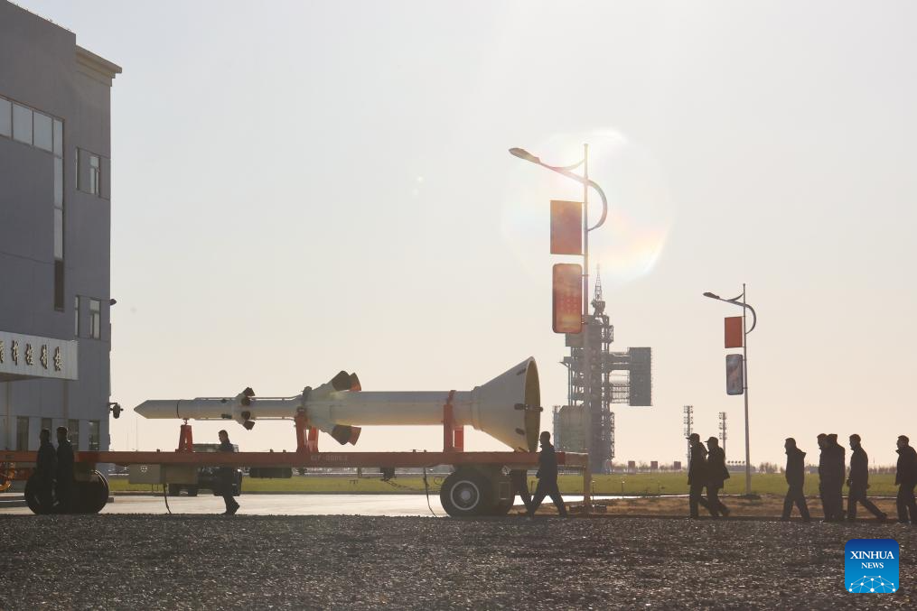 This photo taken on Nov. 20, 2025 shows the combination of the Shenzhou-22 spaceship and the Long March-2F Y22 rocket preparing to be transferred to the launching area. China on Tuesday launched the Shenzhou-22 spaceship to provide a return vessel for the three Shenzhou-21 astronauts in orbit. This momentous occasion marked the accomplishment of the first emergency launch mission in the country's manned space program.