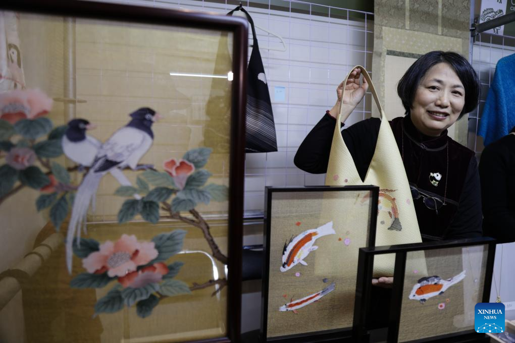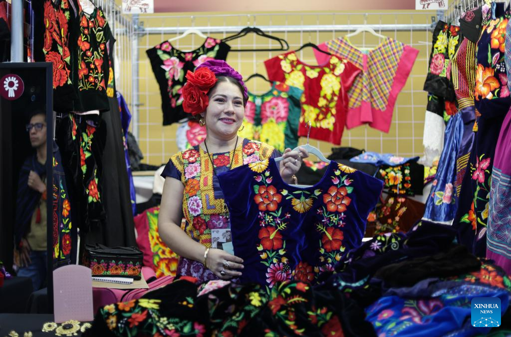 A Chinese artisan displays a handicraft at an original Mexican textile art fair in Mexico City, Mexico, Nov. 28, 2025. The fair brings together artisans from all across Mexico presenting textiles, jewelry, and other handcrafted items. International artisans from several countries, including China, were also invited. (Photo by Francisco Canedo/Xinhua)
