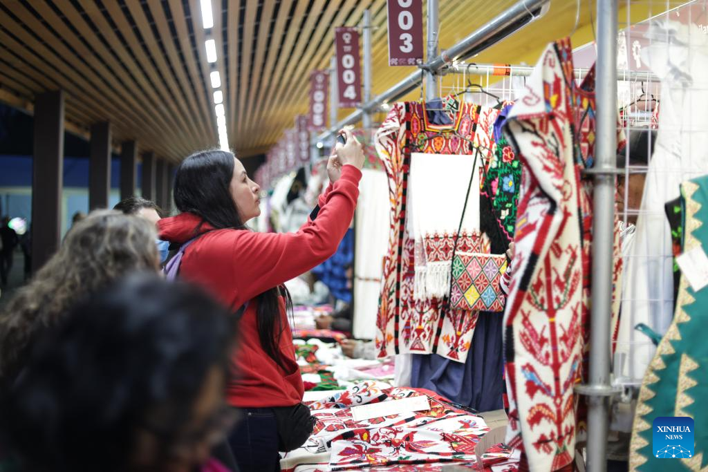 People visit an original Mexican textile art fair in Mexico City, Mexico, Nov. 28, 2025. The fair brings together artisans from all across Mexico presenting textiles, jewelry, and other handcrafted items. International artisans from several countries, including China, were also invited. (Photo by Francisco Canedo/Xinhua)