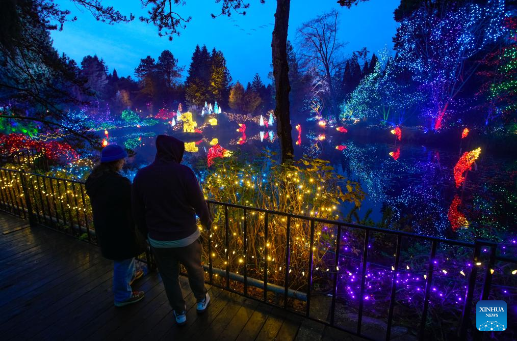 People walk among the light installations at VanDusen Botanical Garden during the annual Festival of Lights in Vancouver, British Columbia, Canada, Nov. 28, 2025. The annual holiday event kicked off here on Friday, with over 1 million lights transforming the garden into a dazzling holiday spectacle. (Photo by Liang Sen/Xinhua)