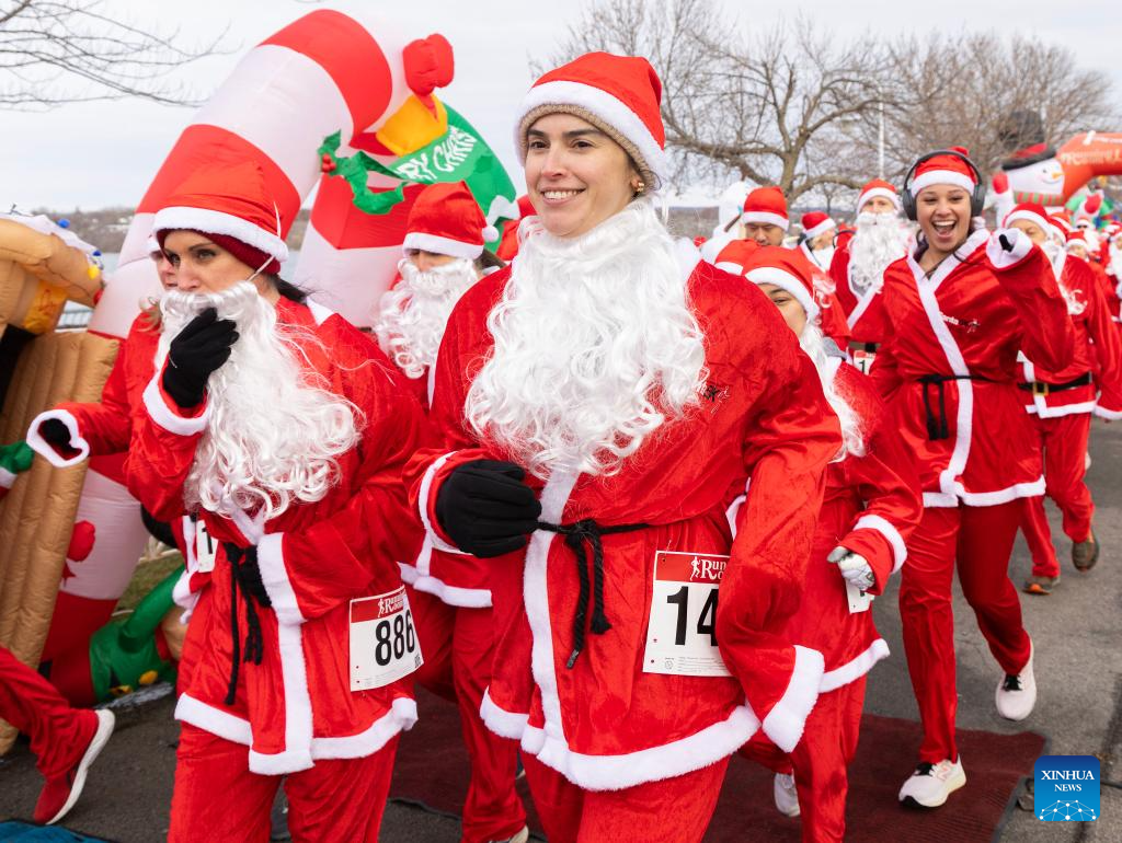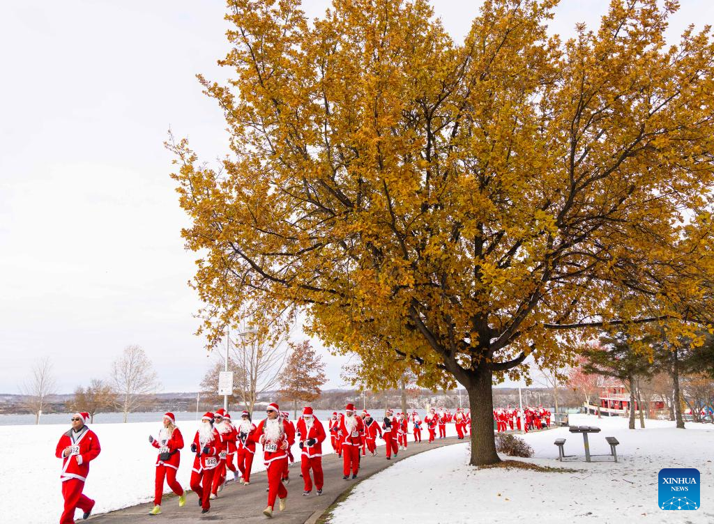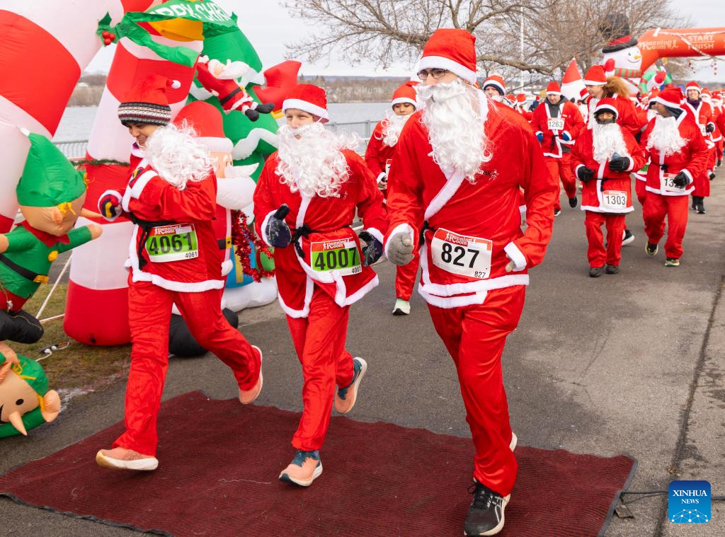 People dressed as Santa Claus attend the 2025 Santa Run in Hamilton, Ontario, Canada, Nov. 29, 2025. Hundreds of participants took part in the annual event on Saturday this year. (Photo by Zou Zheng/Xinhua)