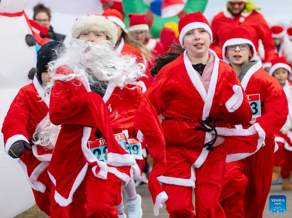 Children dressed as Santa Claus attend the 2025 Santa Run in Hamilton, Ontario, Canada, Nov. 29, 2025. Hundreds of participants took part in the annual event on Saturday this year. (Photo by Zou Zheng/Xinhua)