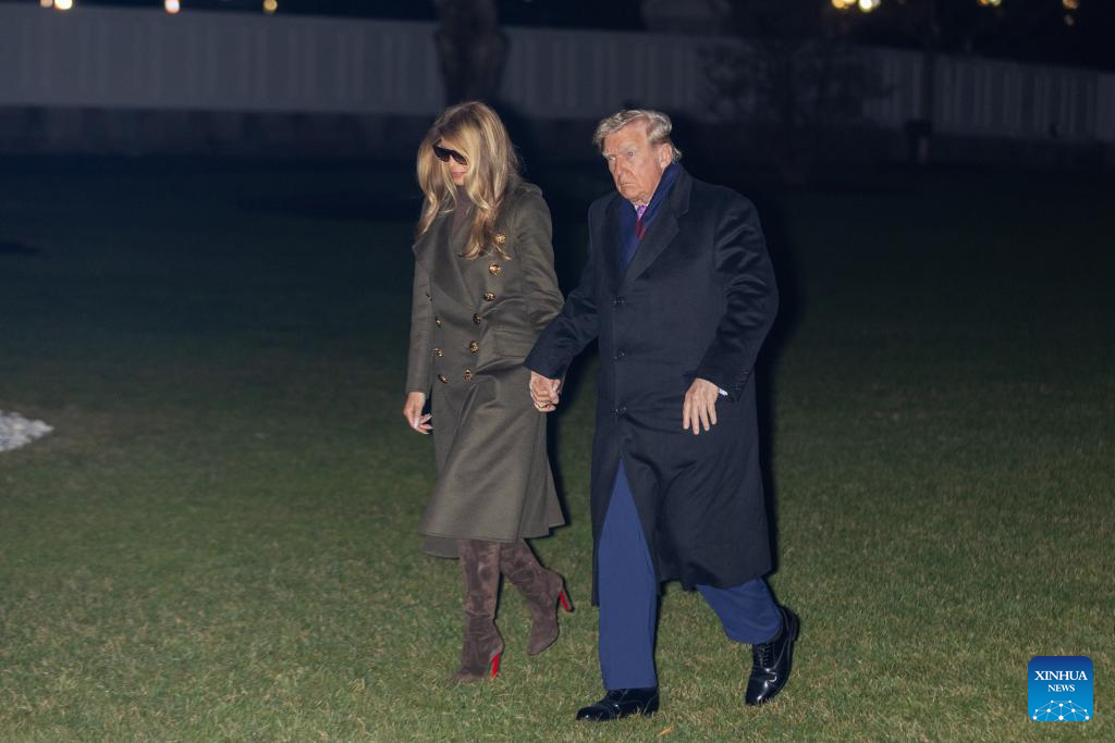 U.S. President Donald Trump and First Lady Melania Trump arrive at the White House in Washington, D.C., the United States, Nov. 30, 2025. U.S. President Donald Trump confirmed on Sunday that he had a phone call with Venezuelan President Nicolas Maduro, but refused to reveal any details of the call, according to The New York Times. (Xinhua/Hu Yousong)