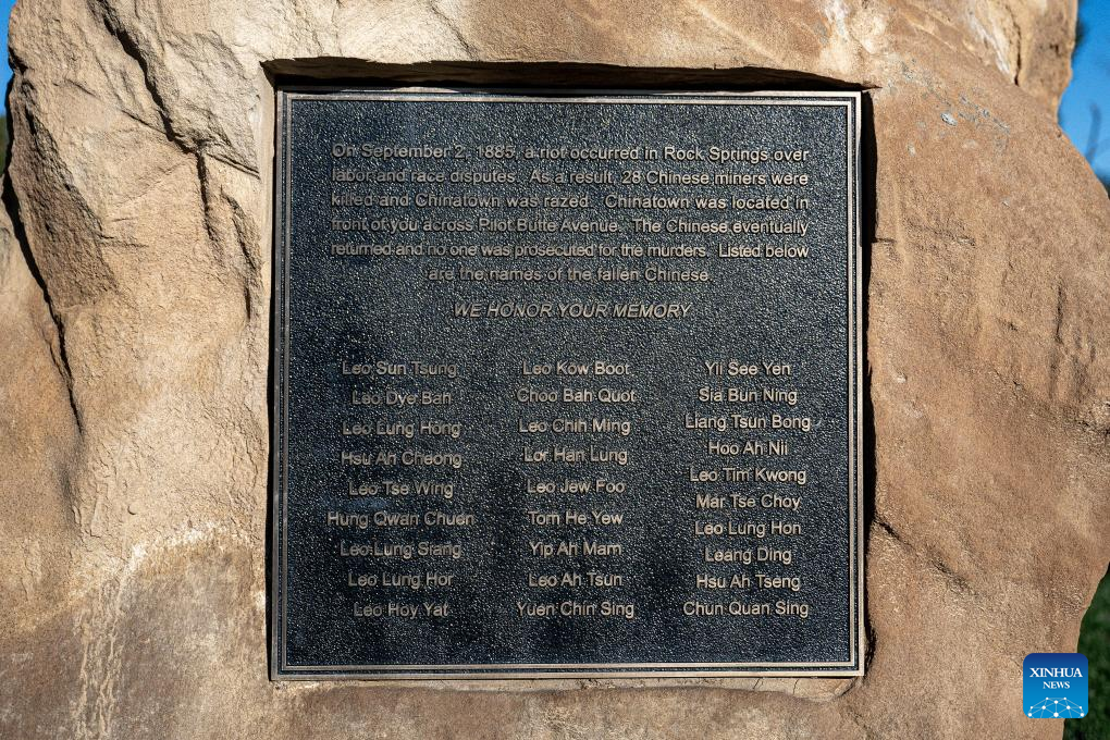 A memorial of the 1885 massacre that decimated Rock Springs' Chinese community stands on the site of Chinatown in Rock Springs, Wyoming, the United States, Oct. 18, 2025. (Photo by Ziyu Julian Zhu/Xinhua)