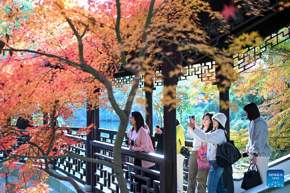 Tourists pose for a selfie at a park in Kunshan City, east China's Jiangsu Province, Dec. 1, 2025. (Photo by Wang Xuzhong/Xinhua)