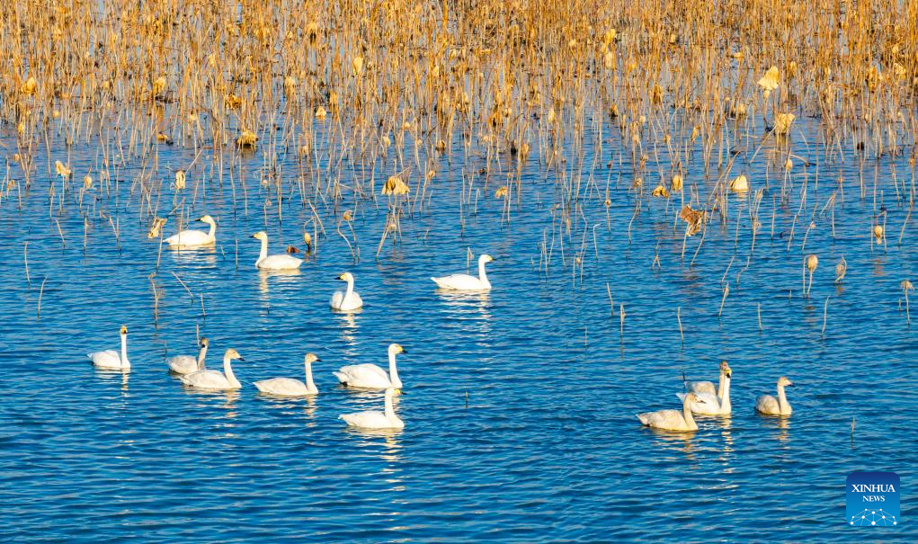 A drone photo taken on Dec. 1, 2025 shows birds at the Lixiahe National Wetland Park in Xinghua City, east China's Jiangsu Province. (Photo by Zhou Shegen/Xinhua)