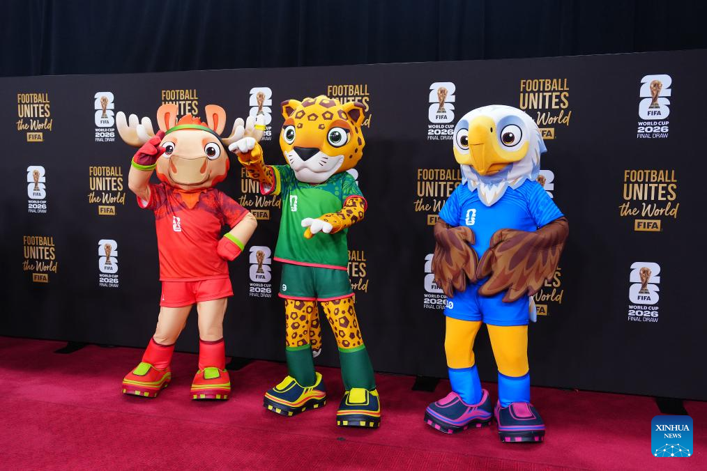 The FIFA World Cup 2026 mascots, Maple the Moose of Canada, Zayu the Jaguar of Mexico and Clutch the Bald Eagle of the U.S.(L-R) arrive on the red carpet ahead of the FIFA World Cup 2026 Final Draw at the Kennedy Center in Washington D.C., the United States, Dec. 5, 2025. (Xinhua/Jia Haocheng)
