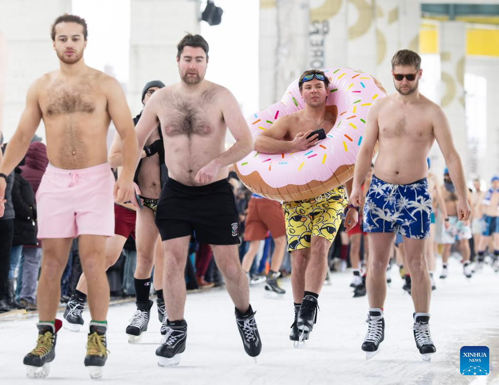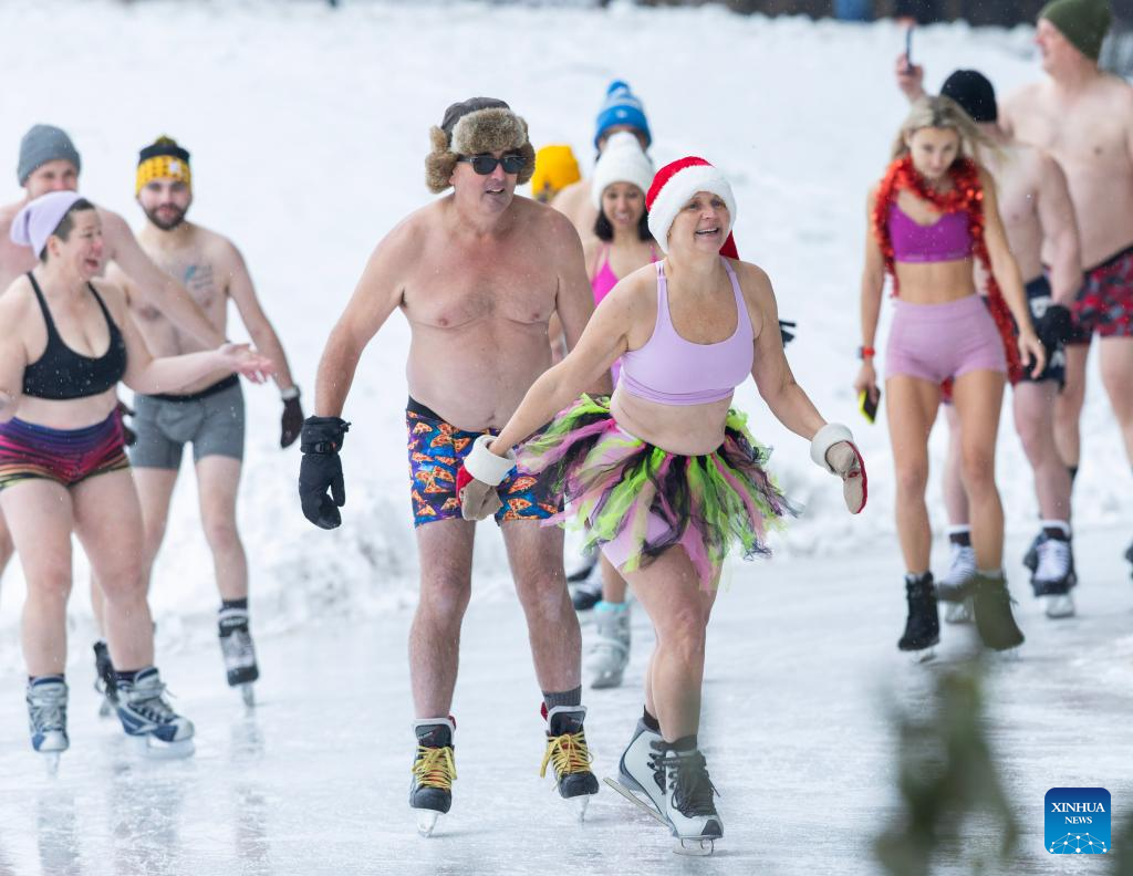 People wearing bathing suits participate in the 2025 Toronto Polar Bear Skate event in Toronto, Canada, on Dec. 28, 2025. About 160 skaters participated in this annual event to bid farewell to 2025 on Sunday. (Photo by Zou Zheng/Xinhua)
