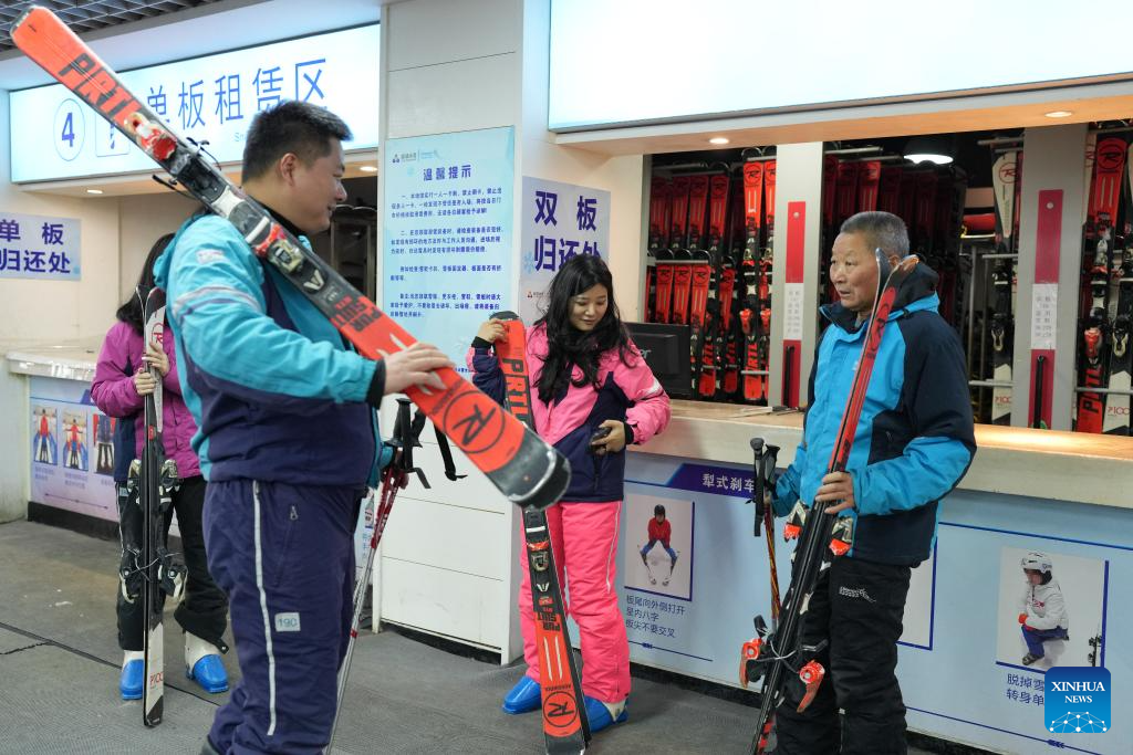 A tourist (L) rents equipment at the Ice and Snow World of the Taihu Lake Longemont Paradise in Changxing County of Huzhou City, east China's Zhejiang Province, Dec. 29, 2025. Skiing and a variety of other winter sports have become a popular seasonal pastime for a growing number of people in Zhejiang Province. The province boasts many ice and snow resorts, both indoor and outdoor, providing ample choices for enthusiasts. Notable examples include the Wansongling Ski Resort in Hangzhou, Qiaobo Ice and Snow World in Shaoxing, Taihu Lake Longemont Paradise in Huzhou, SkyLand ski resort in Anji, and Pan'an ski Resort in Jinhua. Moreover, such facilities are increasingly taking root across the province.