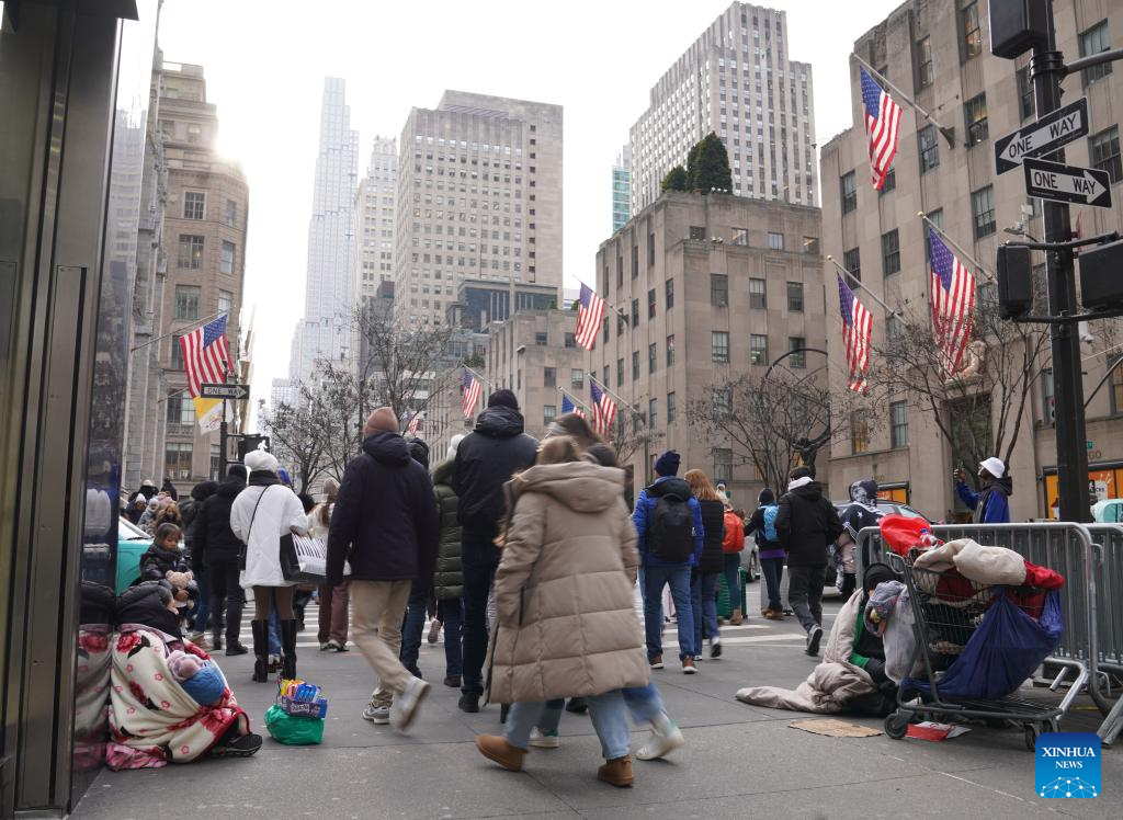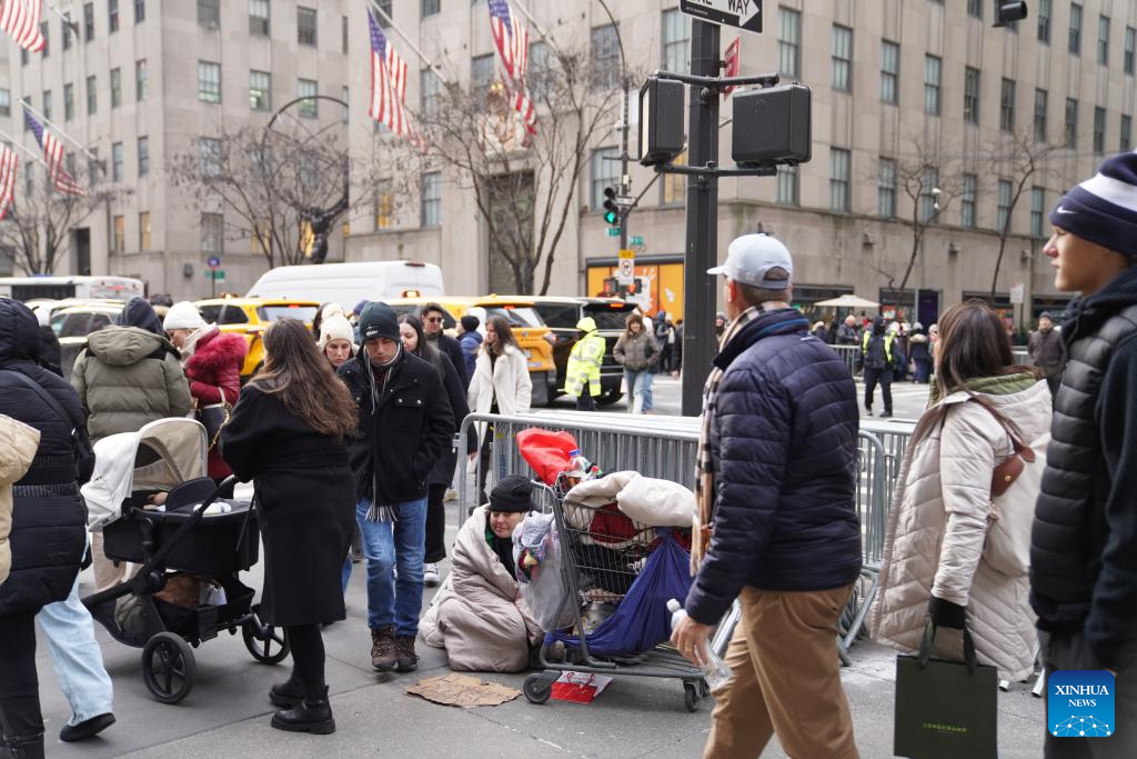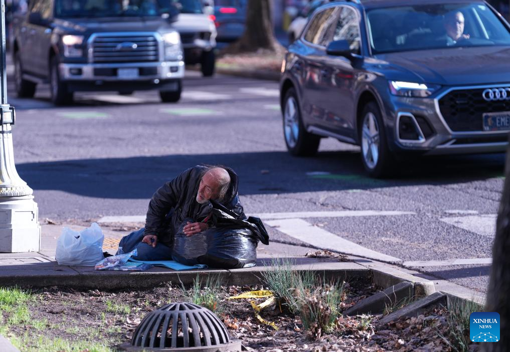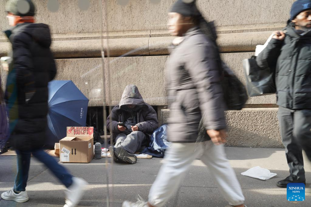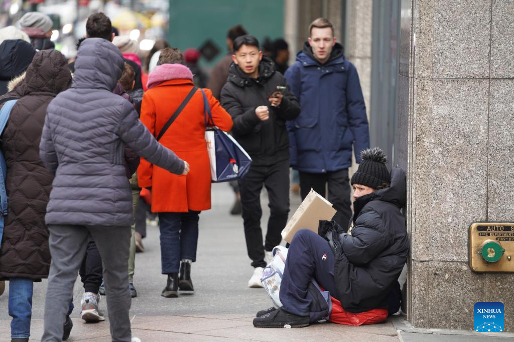 A homeless person sits on the street in New York, the United States, Dec. 31, 2025. (Xinhua/Zhang Fengguo)