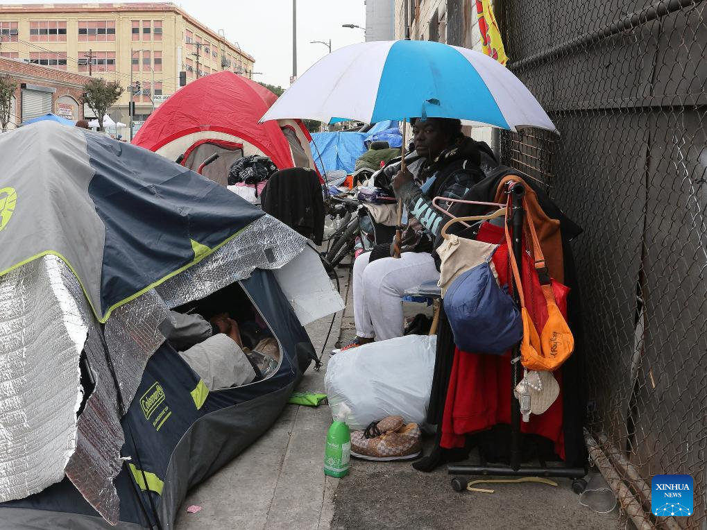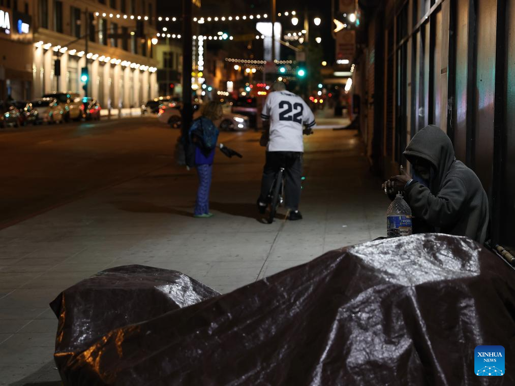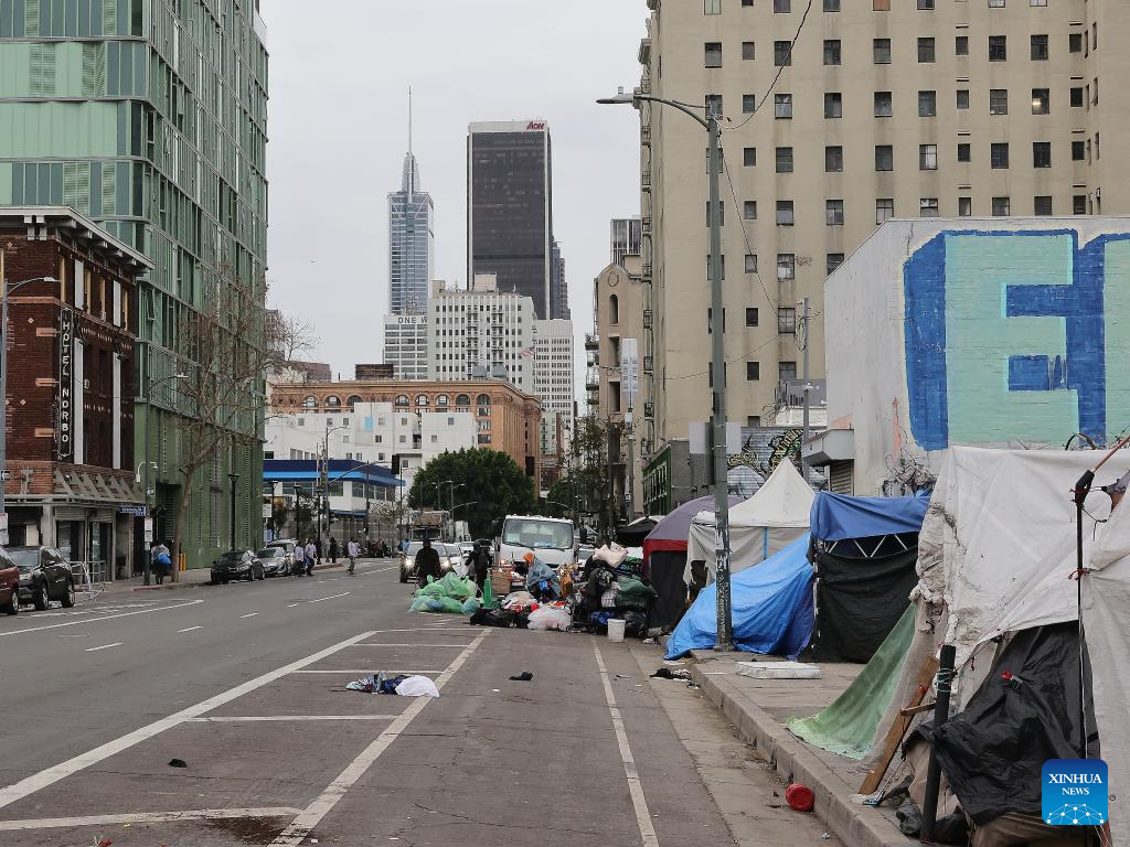 (260101) -- LOS ANGELES, Jan. 1, 2026 (Xinhua) -- Photo taken on Dec. 31, 2025 shows tents of the homeless on the sidewalk of the street in downtown Los Angeles, California, the United States. (Photo by Qiu Chen/Xinhua)