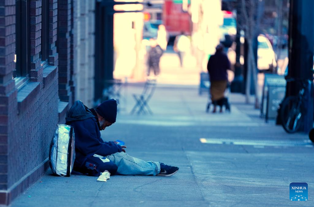 A homeless man sits on the sidewalk in Portland, Oregon, the United States, Dec. 30, 2025. (Str/Xinhua)