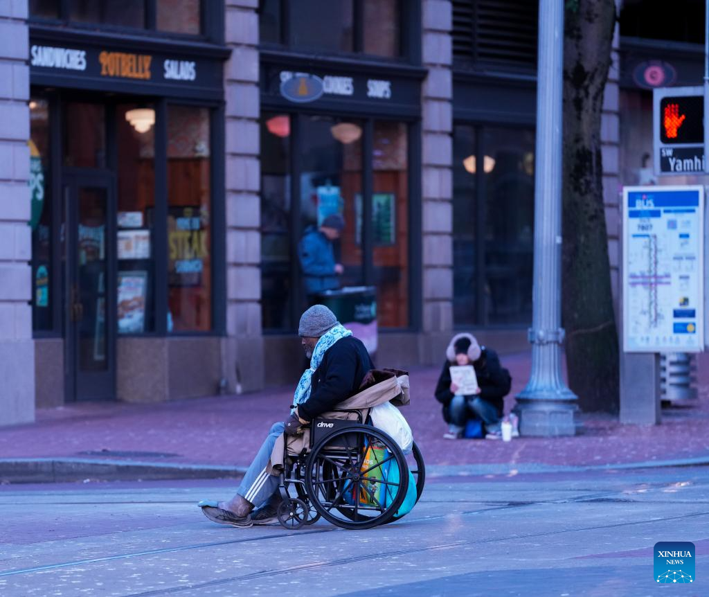 A homeless man walks on the street in Portland, Oregon, the United States, Dec. 30, 2025. (Str/Xinhua)