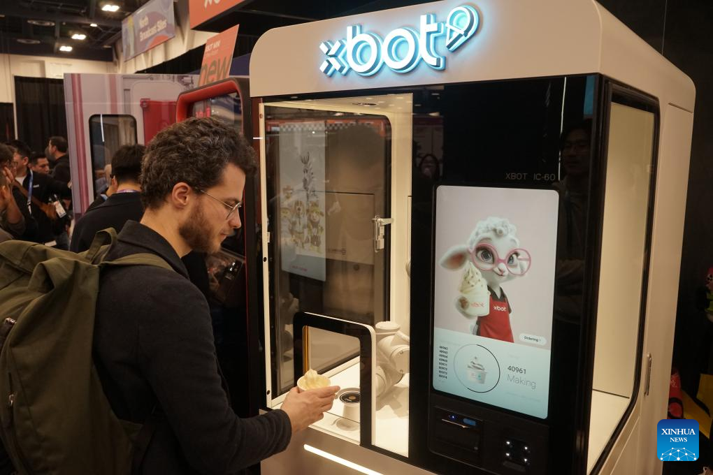 A visitor takes a cup of ice cream from an XBOT robotic barista at the 2026 Consumer Electronics Show (CES) in Las Vegas, the United States, Jan. 7, 2026.