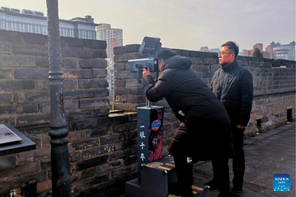 Zhao Bin tests an AR telescope equipment on the Xi'an City Wall in Xi'an, northwest China's Shaanxi Province, Jan. 4, 2026.