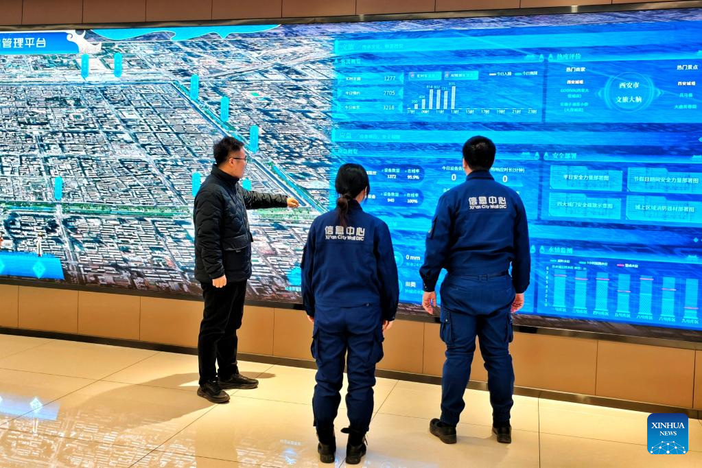 Staff members monitor via a digitalized management platform for the Xi'an City Wall in Xi'an, northwest China's Shaanxi Province, Sept. 10, 2025. (Xinhua/Shao Rui)