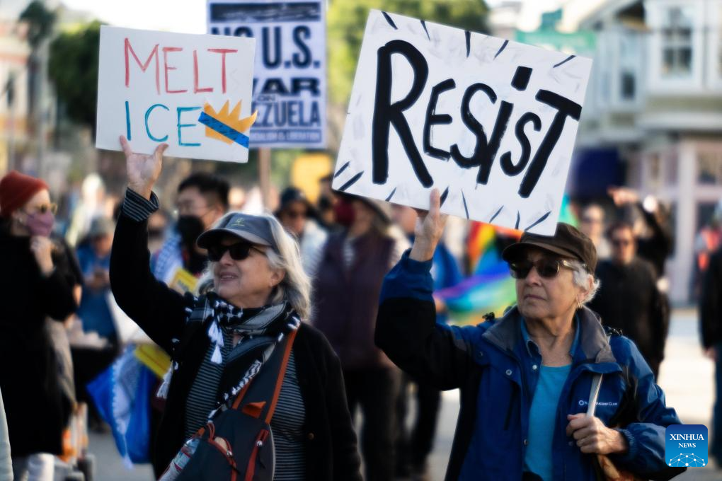 People attend a protest in San Francisco, California, the United States, on Jan. 10, 2026. People gathered here to protest against the U.S. attack on Venezuela, as well as a fatal shooting of a 37-year-old woman by an Immigration and Customs Enforcement agent in Minnesota on Jan. 7. (Photo by Ziyu Julian Zhu/Xinhua)