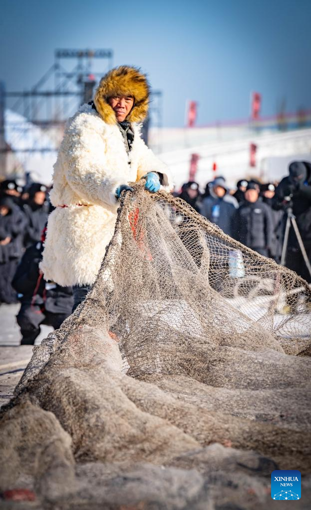 This photo taken on Jan. 10, 2026 shows a fisherman pulling a net out of the frozen surface of the lake during the fourth Hasuhai winter fishing festival in Hohhot, north China's Inner Mongolia Autonomous Region. Hohhot has launched more than 300 winter amusement programs since December 2025, incorporating ice and snow sports, cultural experiences and vogue consumption to boost the local economy. (Photo by Xu Ting/Xinhua)